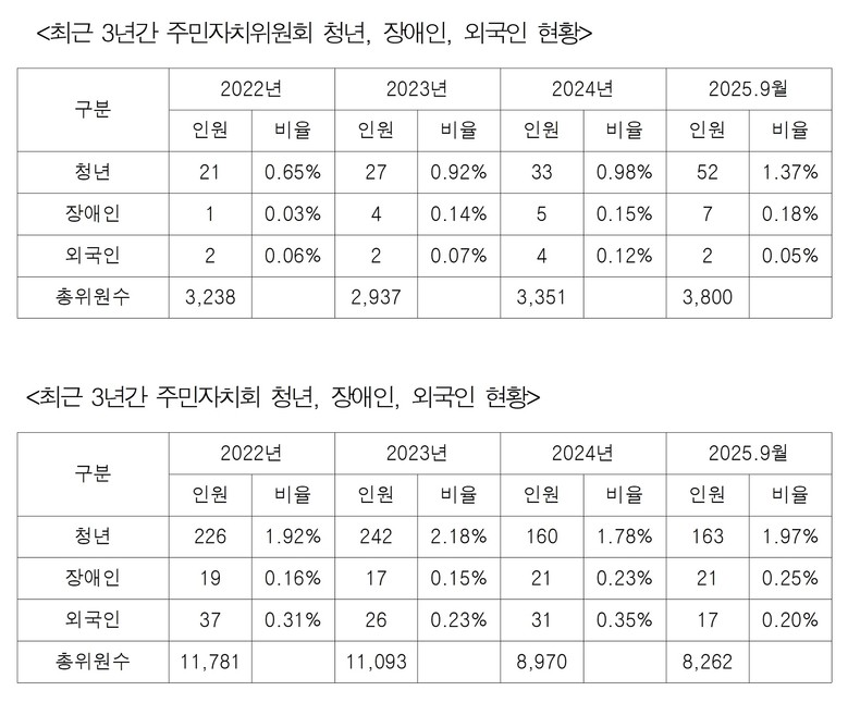 한편 지난해 청년, 장애인, 외국인주민 등 다양한 세대와 배경의 사회구성원이 주민자치회에 적극 참여하도록 지원 범위를 확대하기 위해 발의한 주민자치 활성화 지원에 관한 조례 일부개정조례안이 통과되었음에도 불구하고, 여전히 참여율은 낮은 상황이다.