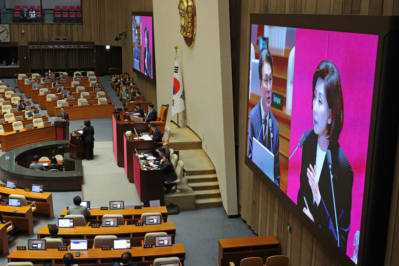 [세계타임즈 = 신상철 기자] 김민석 국무총리가 18일 교육·사회·문화 분야 대정부질문이 열린 국회 본회의장에서 국민의힘 나경원 의원의 질문에 답하고 있다. 2025.9.18