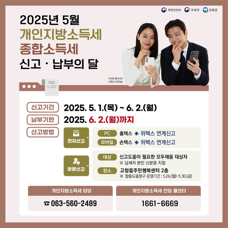 고창군 관계자는 “납세자의 불편 및 혼란 최소화를 위해, 합동도움창구 방문 시 반드시 납세자 본인 신분증과 모두채움안내문을 지참 후 방문해 주시기 바란다”며 기한 내 신고·납부 해 줄 것을 당부했다.
