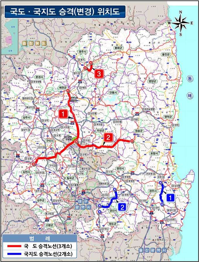 국도승격 3개 노선은 도에서 신공항 연계 교통망으로 중점 추진하고 있는 ▴김천 부곡~김천혁신도시~구미국가5산단~신공항~도청신도시 간 93.5㎞ ▴청송 현동~의성 춘산~신공항 간 59.3㎞ ▴영주 문정~첨단베어링국가산단~영주 상망 간 9.3㎞이며, 국가지원지방도 노선승격 2개노선은 ▴경주 보문단지~경주 강동 간 20.6㎞ ▴경산시청~경산일반산단~영천대창일반산단 간 27.3㎞이다.