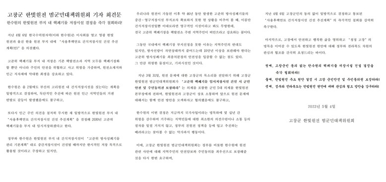 범대위는 임종훈 위원(고창군의원)이 낭독한 성명서를 통해 △고창군민의 동의 없는 한수원의 핵폐기물 저장시설 건설 결정을 즉각 철회할 것 △한빛원전 주요 현안 결정 시 고창군민 안전 및 주민 동의권을 보장할 것 △정부와 전라북도는 한빛원전 현안에 대해 관심과 협조 방안을 강구할 것을 강력하게 촉구하였다.