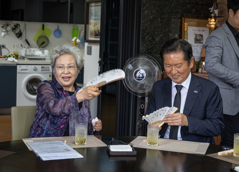 권 여사가 환담 도중 정 대표에게 부채를 부쳐주고 있다. 2025.8.7[더불어민주당 제공]