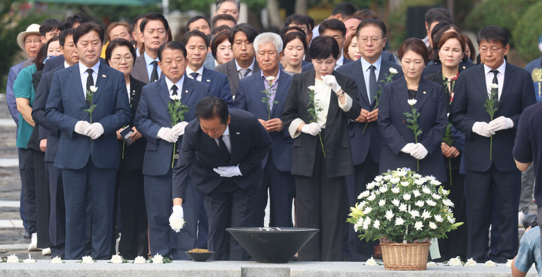 더불어민주당 정청래 대표가 7일 오전 경남 김해시 진영읍 봉하마을을 방문, 노무현 전 대통령 묘역을 참배하며 분향하고 있다. 2025.8.7