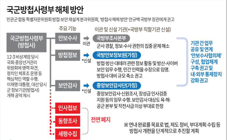 이에 따라 국군방첩사령부가 해체되고 방첩사의 안보수사 기능은 군사경찰인 국방부조사본부로, 방첩정보와 보안감사 기능은 신설되는 국방부 직할기관인 국방안보정보원(가칭)과 중앙보안감사단(가칭)로 각각 이관되며, 인사첩보 및 동향조사 등의 기능은 폐지된다.