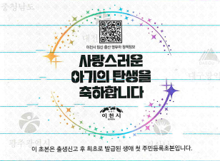 생애 첫 주민등록초본 무료 발급을 통해 아기의 주민등록 신고 사항을 확인하는 동시에 출생 축하 기념스티커에 큐알(QR)코드를 삽입하여 이천시장의 출생 축하 메시지와 함께 출산 가정에 필요한 임신·출산·영유아 지원 사업을 확인할 수 있도록 했다.
