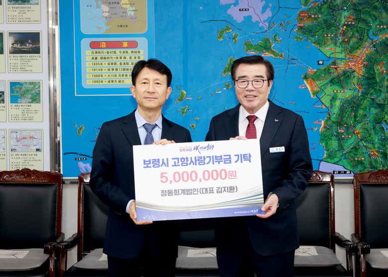 이날 기탁식에는 김지환 정동회계법인 대표이사를 비롯해 김영권 이사, 배진현 이사 등 임직원들이 참석해 보령시에 고향사랑기부금 500만 원을 전달했다.