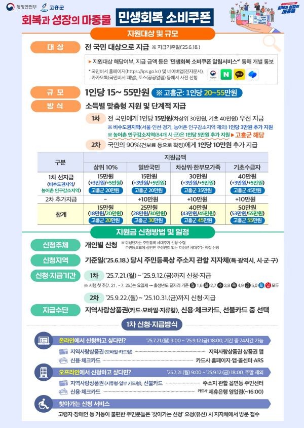 이번 1차로 지급되는 소비쿠폰은 고흥군 기준 최소 20만원에서 최대 45만원이 지급되며, ▲일반군민 20만원 ▲차상위·한부모가족은 35만원 ▲기초생활보장 수급자 45만원이다.