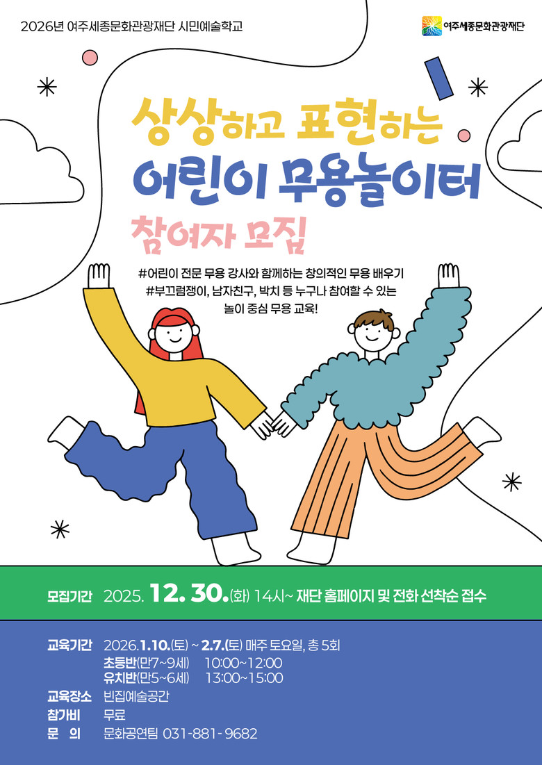 [세계타임즈=여주시 송민수 기자] 여주세종문화관광재단은 오는 1월 10일부터 시민예술학교 <상상하고 표현하는 어린이 무용 놀이터>를 진행한다.