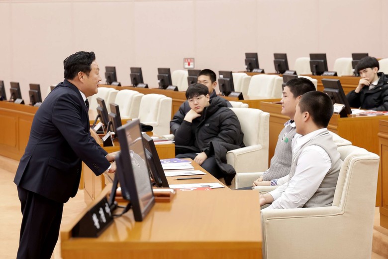 처음부터 학생들과 함께 행사를 지켜본 송인석 의원(국민의힘, 동구1)은 “오늘 여러분이 보여준 적극적인 모습이 정말 대견스럽고, 사회를 조금씩 변화시켜갈 수 있는 중요한 동력이 여러분의 마음에 새겨진 하루였으면 좋겠다”고 말했다. 이어 “우리나라에서 노벨문학상 수상자가 나온 만큼 독서를 하자는 취지의 자유발언에 대해 깊이 공감했고, 이를 실천하는 여러분이 대견하다”며 학생들과 즐거운 대화를 이어갔다.