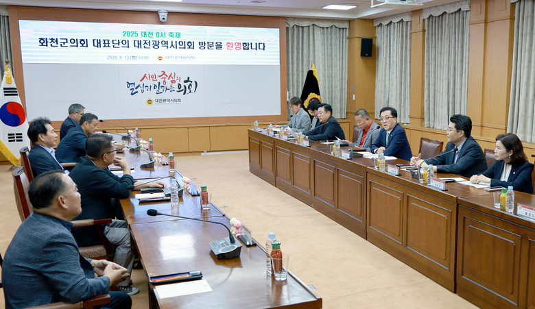 [대전 세계타임즈=이채봉 기자] 대전시의회(의장 조원휘)는 12일, 대전 0시 축제 기간을 맞아 작년에 이어 올해도 대전시를 방문한 강원특별자치도 화천군의회 대표단과 환담을 갖고 양 의회 간 교류 확대 방안을 논의했다.