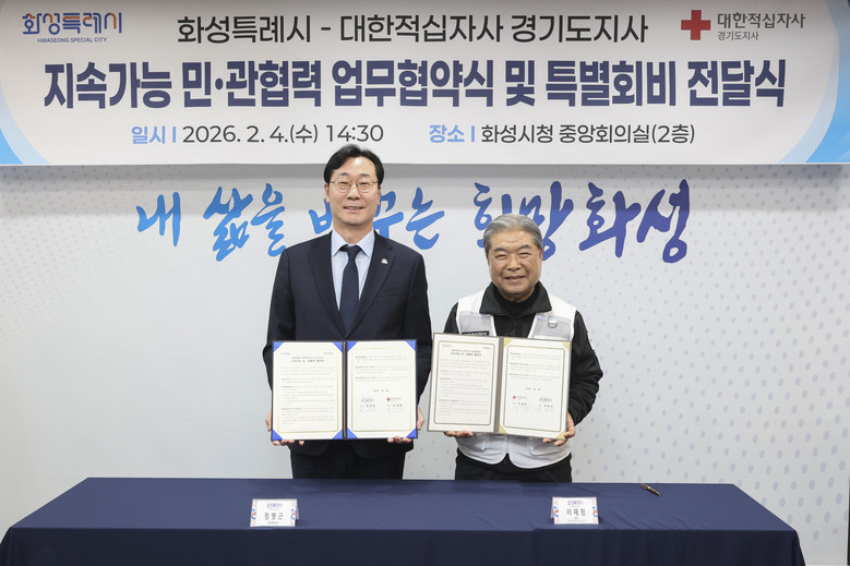○ 2026년도 적십자 특별회비 전달식 함께 진행 [세계타임즈=화성시 송민수 기자] 화성특례시(시장 정명근)와 대한적십자사 경기도지사(회장 이재정)가 4일 화성시청에서 지속가능한 민·관협력 거버넌스 구축을 위해 업무협약을 체결했다.
