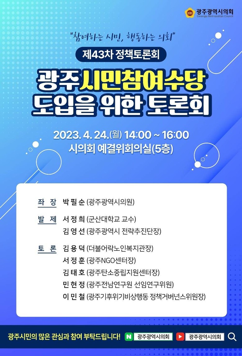 이어 광주시 김영선 전략추진단장이 광주시민참여수당 기본안 및 추진방향을, 박필순 의원이 광주시민참여수당 조례안을 발표한다.