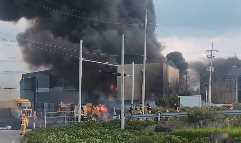 [아산 세계타임즈 = 이현진 기자] 17일 4시 4분께 충남 아산시 신창면 수장리의 한 폐유 정제 공장에서 불이 나 소방당국이 진화 작업을 벌이고 있다. 2024.8.17 [독자 제공]