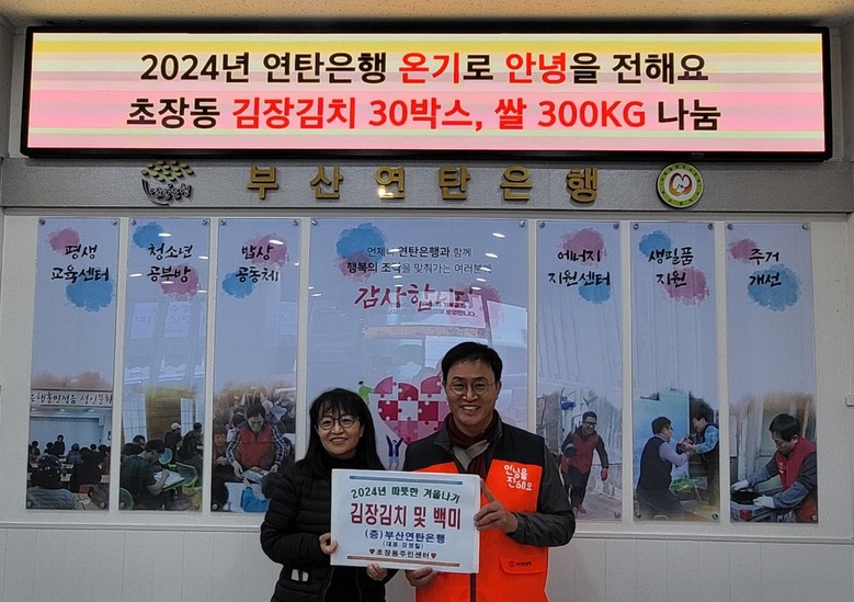 [서구 세계타임즈=이용우 기자] (사)부산연탄은행(대표 강정칠)은 지난 21일 따뜻한 겨울나기를 위하여 초장동주민센터(동장 이명희) 취약계층을 대상으로 김장김치 30박스, 백미 30포(10kg)를 전달하며 따뜻하고 훈훈한 이웃사랑을 실천하였다.
