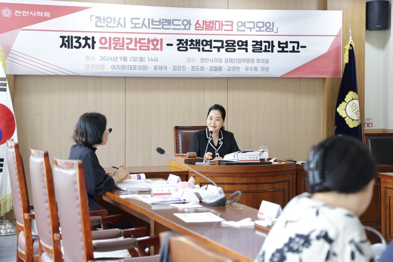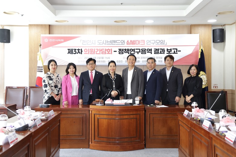 [천안시 세계타임즈=백택기 기자] 천안시의회 「천안시 도시브랜드와 심벌마크 연구모임」(대표의원 이지원)이 9월 2일 경제산업위원회 회의실에서 제3차 의원간담회를 열고 ‘정책연구용역 결과’를 발표했다.