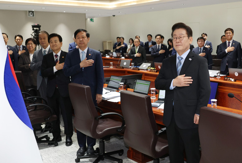 이재명 대통령이 2일 용산 대통령실에서 열린 국무회의에서 국기에 경례하고 있다. 2025.9.2