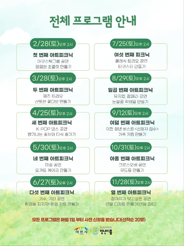 김경희 이천시장은 “지역의 소중한 인적 자원과 청년들의 열정이 만나는 ‘아트피크닉’이 청년이룸의 대표 프로그램으로 정착하게 되어 기쁘다”라고 하며, “청년들이 단순히 문화를 소비하는 주체를 넘어, 스스로 콘텐츠를 창조하고 이끄는 문화예술의 주인공으로 성장하길 바란다”라고 말했다.