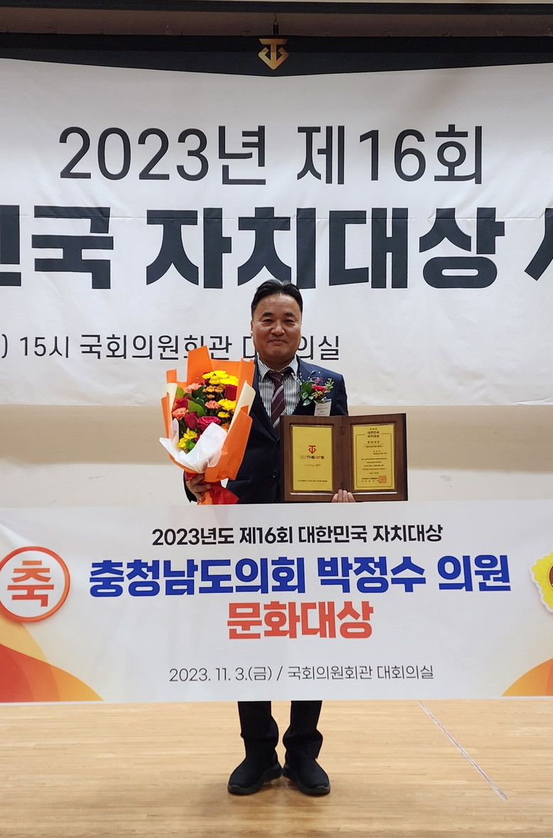 [충남 세계타임즈=백택기 기자] 충남도의회 박정수 의원(천안9·국민의힘)은 3일 국회의원회관 대회의실에서 열린 제16회 대한민국 자치대상에서 광역의회 부문 문화대상 수상의 영예를 안았다.