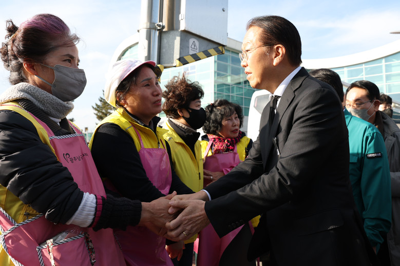 국민의힘 권영세 비상대책위원장이 30일 제주항공 참사 현장인 전남 무안국제공항을 찾아 자원봉사자들을 격려하고 있다. 2024.12.30 [공동취재]