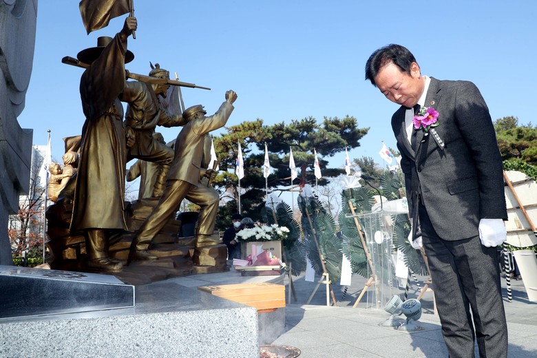 [충북 세계타임즈=이현진 기자] 제83회 순국선열의 날 기념식에서 충북도의회 황영호 의장이 추모사를 하고 있다.(17일 오전 11시 삼일공원 항일독립운동 기념탑)/충북도의회 제공