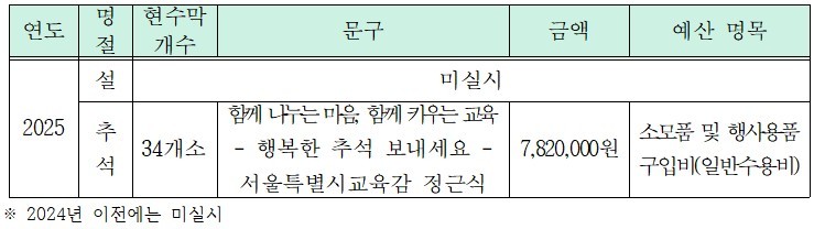 서울시교육청이 제출한 ‘최근 5년간 교육감 명절 현수막 게첩 현황’에 따르면 올해 추석 교육청은 ‘함께 나누는 마음, 함께 키우는 교육, 행복한 추석 보내세요. 서울특별시교육감 정근식’이라는 현수막을 서울시 내 34개소에 게첩한 것으로 나타났다. 예산은 약 8백만 원 상당 소요됐으며, 예산 명목은 본예산에 편성됐던 ‘소모품 및 행사용품 구입비’로 지출됐다.