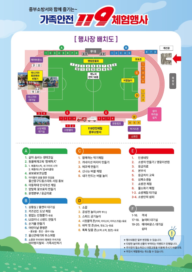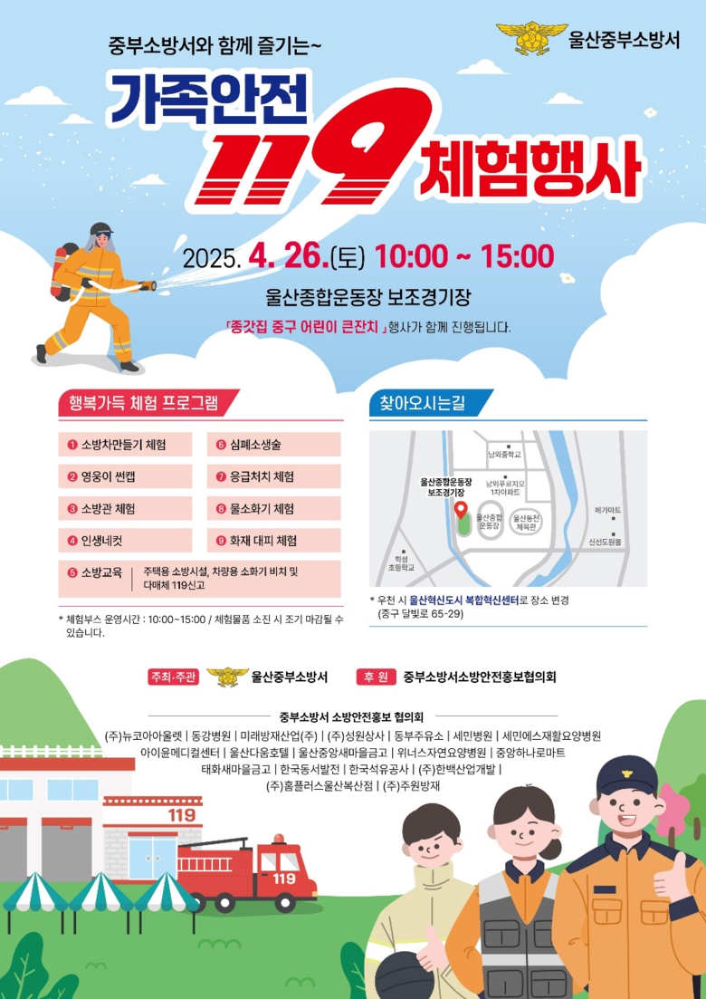 [세계타임즈=울산 이호근 기자] 울산 중부소방서는 4월 26일(토) 오전 10시부터 오후 3시까지 중구 남외동 종합운동장 보조경기장에서 ‘가족안전 119체험행사’를 개최한다고 밝혔다.