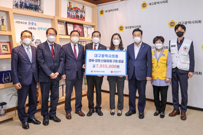 장상수 의장은 “갑작스러운 산불로 삶의 터전을 잃은 경북·강원 지역 주민들에게 조금이나마 용기를 드리고자 대구시의원과 직원들이 한결 같은 정성으로 성금을 마련했다”며,“피해 복구가 조속히 마무리 되어 지역 주민들이 하루 빨리 일상으로 돌아갈 수 있기를 간절히 바란다”고 말했다.