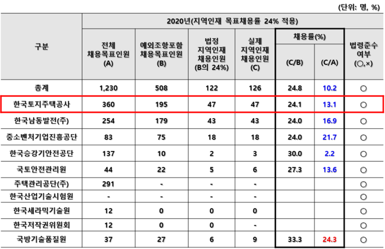 <경남혁신도시 이전 공공기관별 지역인재 채용률(지역인재 의무채용 예외조항 적용 구분)>