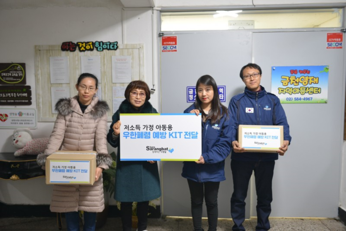 | ▲함께하는 사랑밭은 저소득가정 아동을 위한 우한 폐렴 예방 KIT를 금천 영재지역아동센터에 전달했다. |