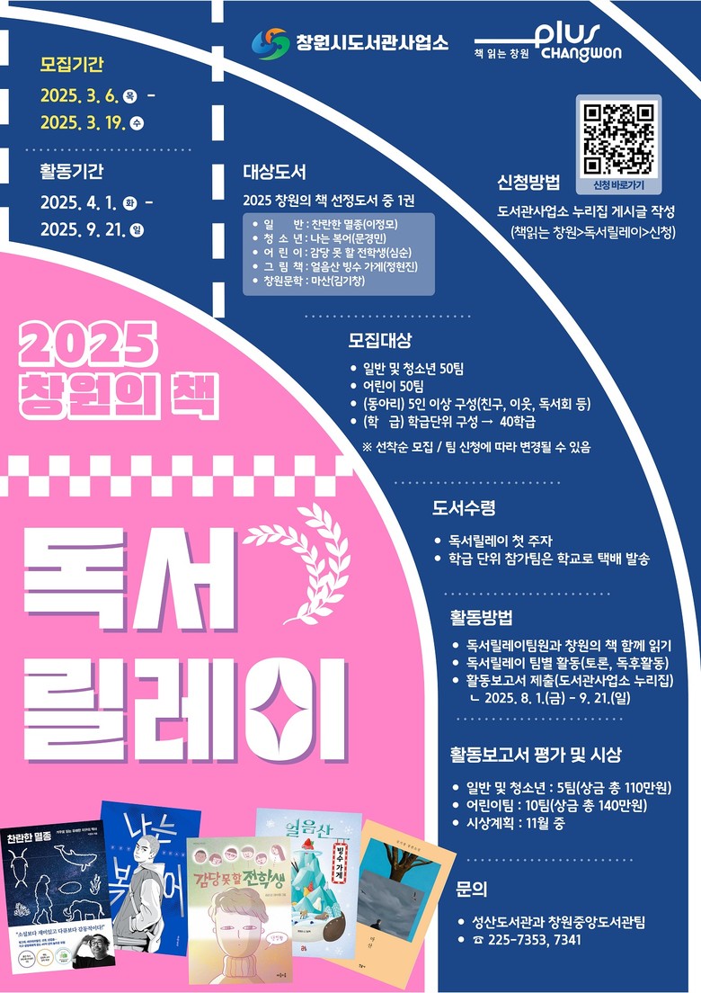 박진열 창원시도서관사업소장은 “2025 창원의 책 함께 읽기의 시작으로 독서릴레이팀을 모집하니 많은 신청을 바라며, 가족, 친구, 이웃과 함께 책을 통해 소통하고 독서의 즐거움을 나누는 기회가 되기를 바란다”고 말했다.