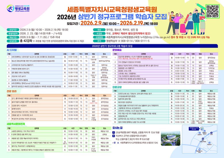 접수는 평생교육원 누리집(life.sje.go.kr) 강좌 신청 메뉴에서 2월 9일(월) 10시부터 2월 19일(목) 18시까지 진행되며, 1인 2강좌 이내로 신청할 수 있다. 선정 결과는 2월 23일(월) 14시에 안내된다.