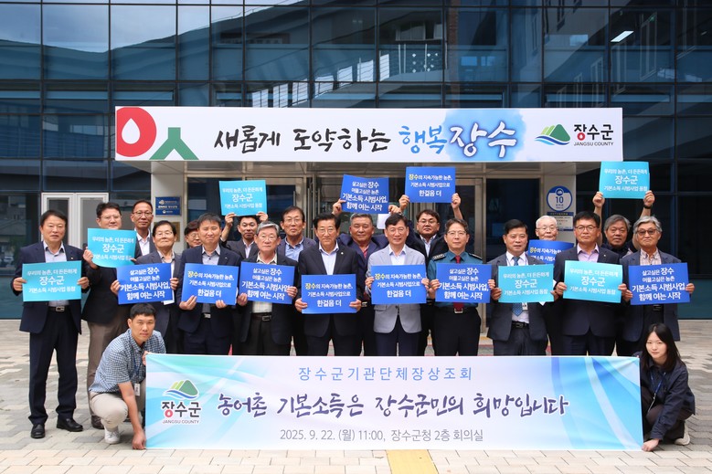 군은 22일 군청 회의실에서 최훈식 장수군수를 비롯해 최한주 군의회의장, 황재현 장수경찰서장, 추영곤 장수교육지원청교육장 등 주요 기관·단체장 20여 명이 참여한 ‘2025년 제2차 기관·단체장 상조회’를 통해 농어촌 기본소득 시범사업 선정을 위한 협력을 다졌다.