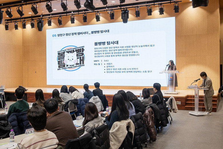특히 ‘청년 담론발표’ 시간에는 행정인턴 50명이 6개 팀으로 나눠 △청년 정책 홍보단 ‘볼빵빵 탐사대’ △청년 관점에서의 ‘전통시장 활성화’ △목공 활동을 통한 고립 청년의 생활 문제 개선 △양천구 청년 간 네트워크 활성화 등 청년의 시각으로 다양한 정책 아이디어를 제안했다.