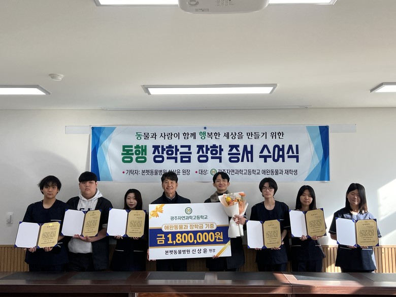 [광주 세계타임즈=손권일 기자] 광주자연과학고가 8일 오후 2시 본교에서 본펫동물병원 신상윤 원장으로부터 애완동물과 학생들을 위한 동행 장학금을 받고 이에 대한 전달식을 개최했다고 밝혔다.