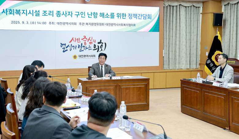 [대전 세계타임즈=이채봉 기자] 대전시의회 복지환경위원회는 3일 시의회 소통실에서 이효성 의원(국민의힘, 대덕구1) 주재로 「사회복지시설 조리 종사자 구인 난항 해소 정책간담회」를 개최했다.