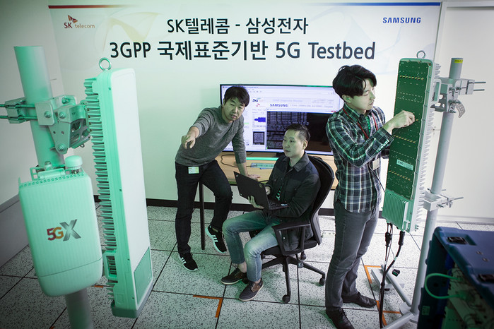 | ▲ SK텔레콤과 삼성전자 연구원들이 15일 SK텔레콤 분당사옥 5G 테스트베드에서 3.5GHz 대역 5G상용 장비로 퍼스트콜(First call)에 성공했다. |