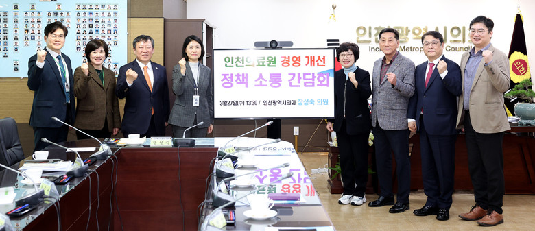 인천시의회는 27일 의회 본관 2층 의장실에서 이봉락 의장을 비롯해 신영희 제1부의장, 장성숙·김대중·조현영 의원, 인천시 보건복지국 신남식 국장, 인천의료원 조승연 원장 등이 참석한 가운데 인천의료원 운영 정상화를 위한 ‘정책 소통 간담회’를 개최했다.