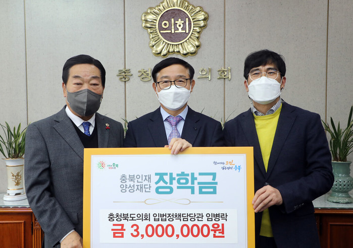 [충북=세계타임즈 이현진 기자] 충청북도의회사무처 임병락 입법정책담당관이 28일 충북인재양성재단(이사장 이시종)에 장학금 300만원을 기탁했다.