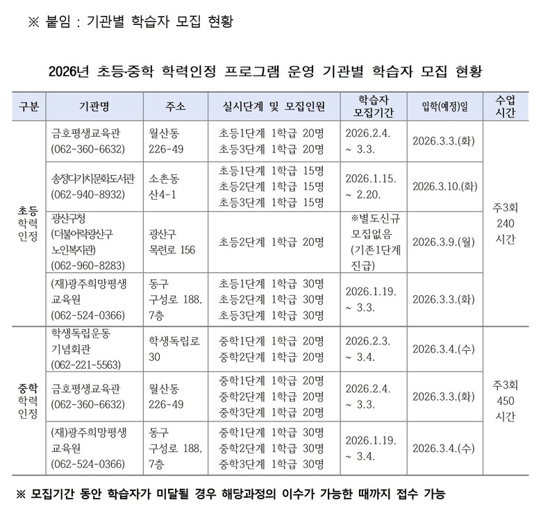[광주 세계타임즈=손권일 기자] 광주시교육청(교육감 이정선)은 ‘2026년도 초등·중학 학력인정 문해교육 프로그램 학습자’를 모집한다.