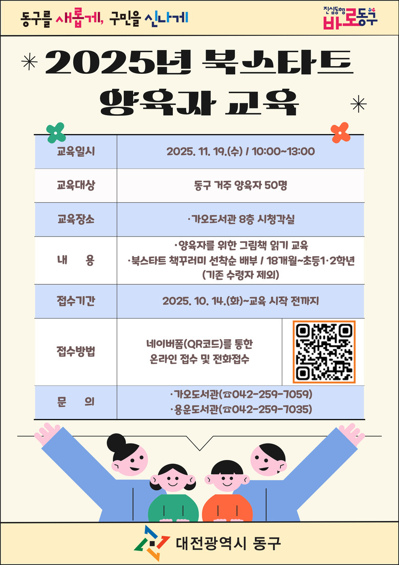 교육 참여는 영유아 및 초등 저학년 자녀를 양육하는 지역 주민이면 누구나 가능하며, 오는 14일부터 네이버 폼(QR코드)을 통한 온라인 접수 또는 가오·용운도서관 어린이자료실 현장 접수가 가능하다.