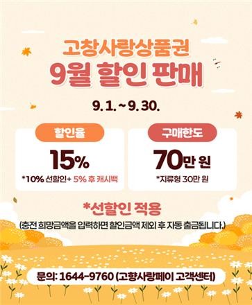 확대된 15% 할인율은 9월부터 적용되며, 구매시 10% 선할인에 고창사랑카드 결제시 5% 후캐시백이 추가로 지급된다.