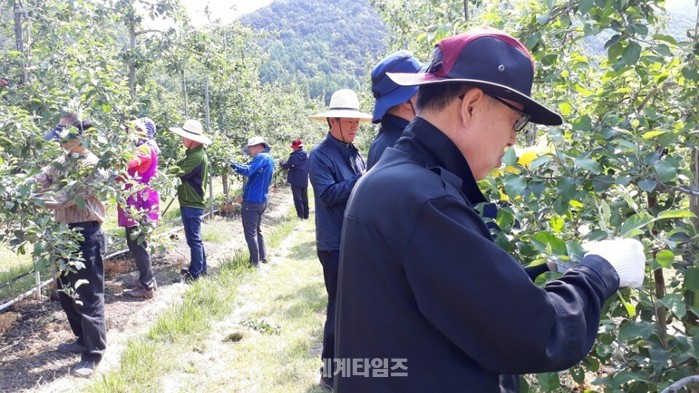청주시 농업정책국 직원 40여명은 18일 본격 영농철을 맞아 일손이 부족한 미원면 계산리 사과과수원을 찾아 사과 과실 솎기 작업을 지원했다.