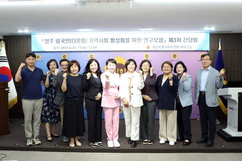 [세종 세계타임즈=이채봉 기자] 세종특별자치시의회(의장 임채성)는 25일 의회 청사 1층 대회의실에서 ‘정주 외국인(다문화) 지역사회 활성화를 위한 연구모임’(대표의원 홍나영) 제3차 간담회를 열고, 세종시 외국인 주민의 현황과 관련 정책 사례를 공유하는 시간을 가졌다.