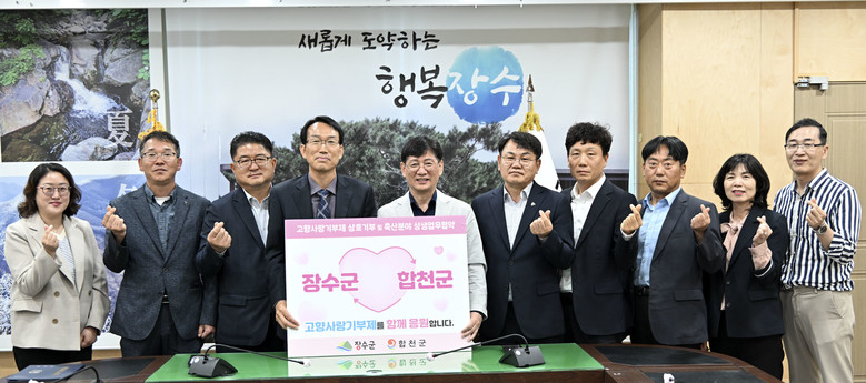 - 고향사랑기부제 상호기부도 함께 진행, 기부문화 확산에 뜻 모아 [세계타임즈=장수군 김서주 기자] 장수군(군수 최훈식)은 자매결연지인 합천군(군수 김윤철)과 9일 장수군청 회의실에서 축산분야의 발전과 상생 협력을 위한 업무협약을 체결했다.