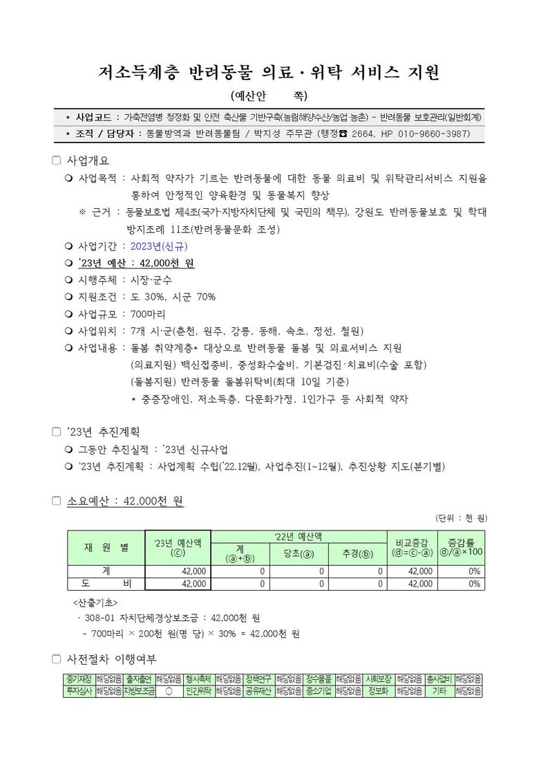 제315회 강원도의회 정례회 예산결산특별위원회(이하 ‘예결특위’라고 한다)에서 반려동물 지원사업 예산 4,200만원이 통과되어, 향후 23년부터 저소득층, 중증장애인, 홀로 사는 어르신 등 사회적 약자들의 반려동물의 양육환경이 더욱 개선 될 것으로 보인다.