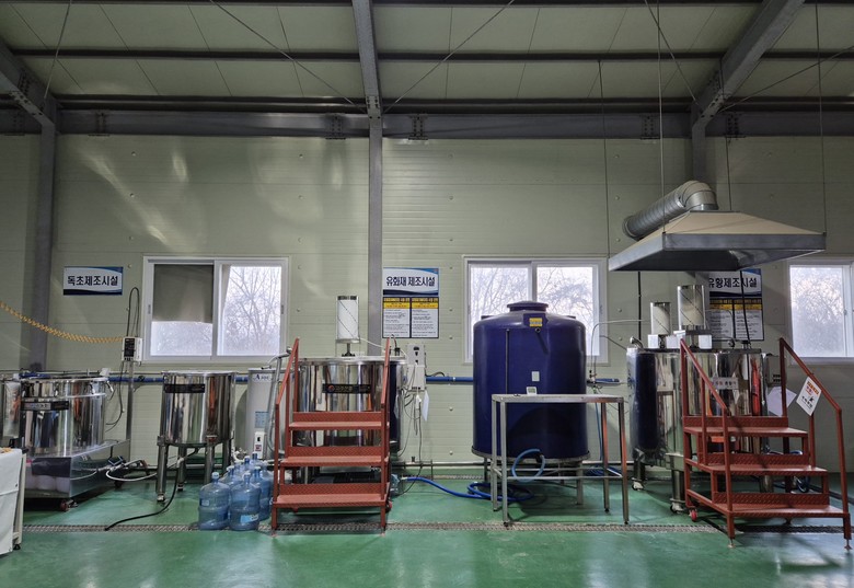무상 공급량을 초과해 추가 자재가 필요한 경우에는 제조시설을 활용해 농업인이 직접 유기농자재를 생산할 수 있으며, 시설 이용은 사전 신청 후 가능하고 제조 기간은 유황과 독초는 2일, 유화제는 7일이 각각 소요된다.