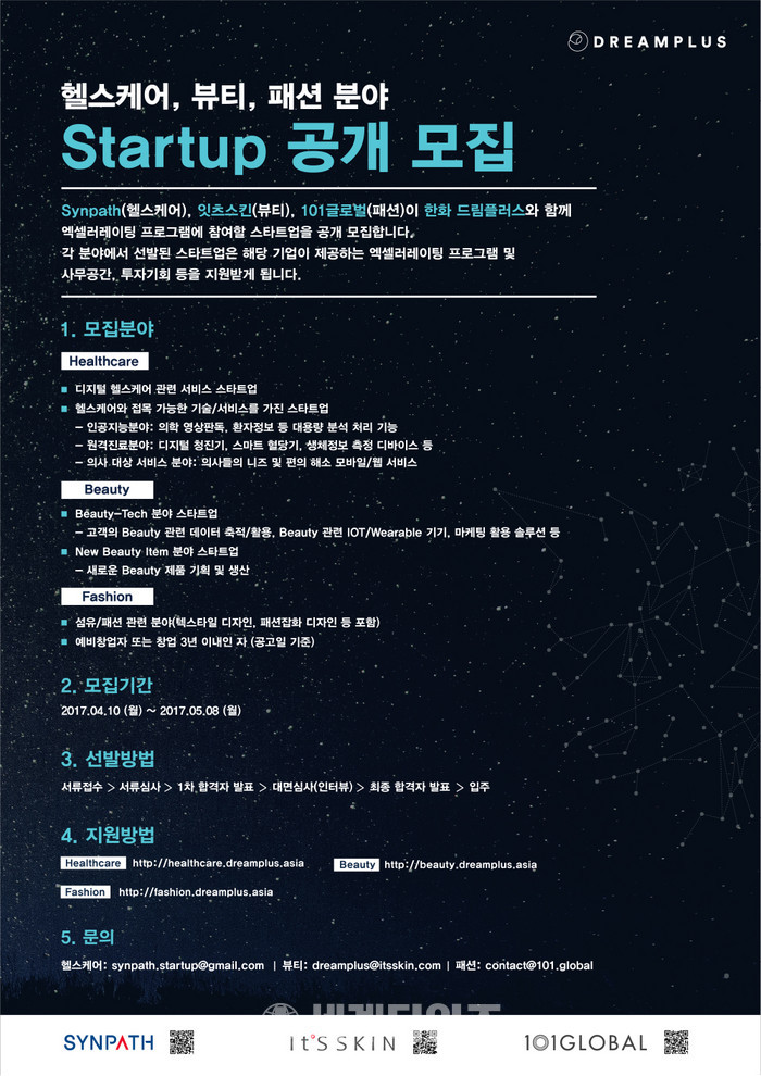 드림플러스의 지원을 받는 ㈜Synpath, 잇츠스킨, 101글로벌 3사는 헬스케어, 뷰티, 패션 분야의 스타트업을 선발하여 육성할 계획으로 드림플러스는 스타트업 네트워크를 위한 공간을 기획, 구성하고 그 동안 쌓아온 오픈 이노베이션 및 엑셀러레이팅 노하우를 전달한다.