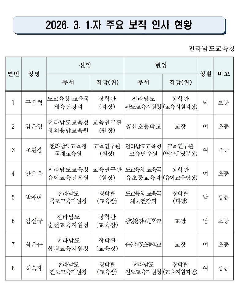 [전남 세계타임즈=우덕현 기자] 전라남도교육청(교육감 김대중)이 2월 2일(월) 2026년 3월 1일자 주요 보직 임 용 대상자 8명을 확정 발표했다.