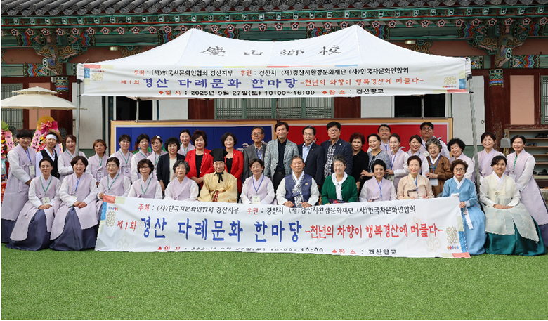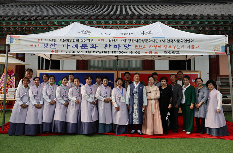 사진은: 한국차문화연합회 임원 및 경산지부 단체사진 제1회 경산 다례문화 한마당 '다례대회' 성료!