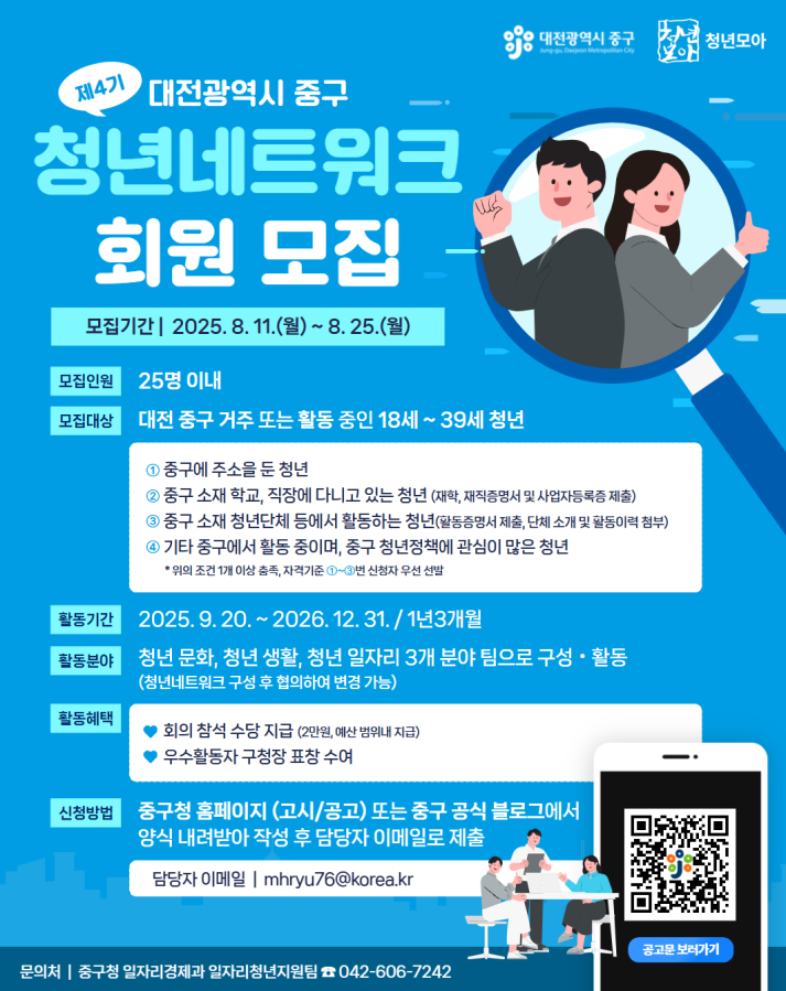 참여를 희망하는 청년은 중구청 누리집(고시/공고)에 게재된 신청서를 작성해, 25일까지 이메일(mhryu76@korea.kr)로 제출하면 된다. 심사결과는 선정자에 한해 9월 1일 개별 통보할 예정이며, 자세한 사항은 중구청 일자리경제과(☎042-606-7242)로 문의하면 된다.